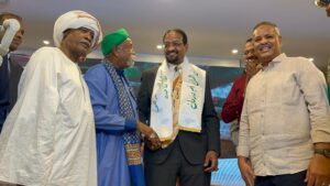 وخلال الحفل، جرى تكريم الشيخ الأمين عمر الأمين بمنحه درع “أبو الغلابة”، تكريماً لمسيرته الممتدة في دعم الفقراء والمحتاجين، إلى جانب شهادة الدكتوراه الفخرية من جامعة كامبريدج مودرن كوليدج، وكذلك لقب السفير الفخري من الاتحاد العربي الأفريقي للتكامل الاقتصادي للسلام الدولي.